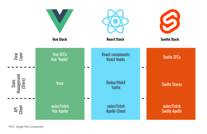 Presentation: этот уровень в основном состоит из компонентов пользовательского интерфейса. Для Vue это Vue SFcs. Для React это компоненты React. Для Svelte это SFC Svelte. И так далее. Уровень представления напрямую связан с уровнем приложения.