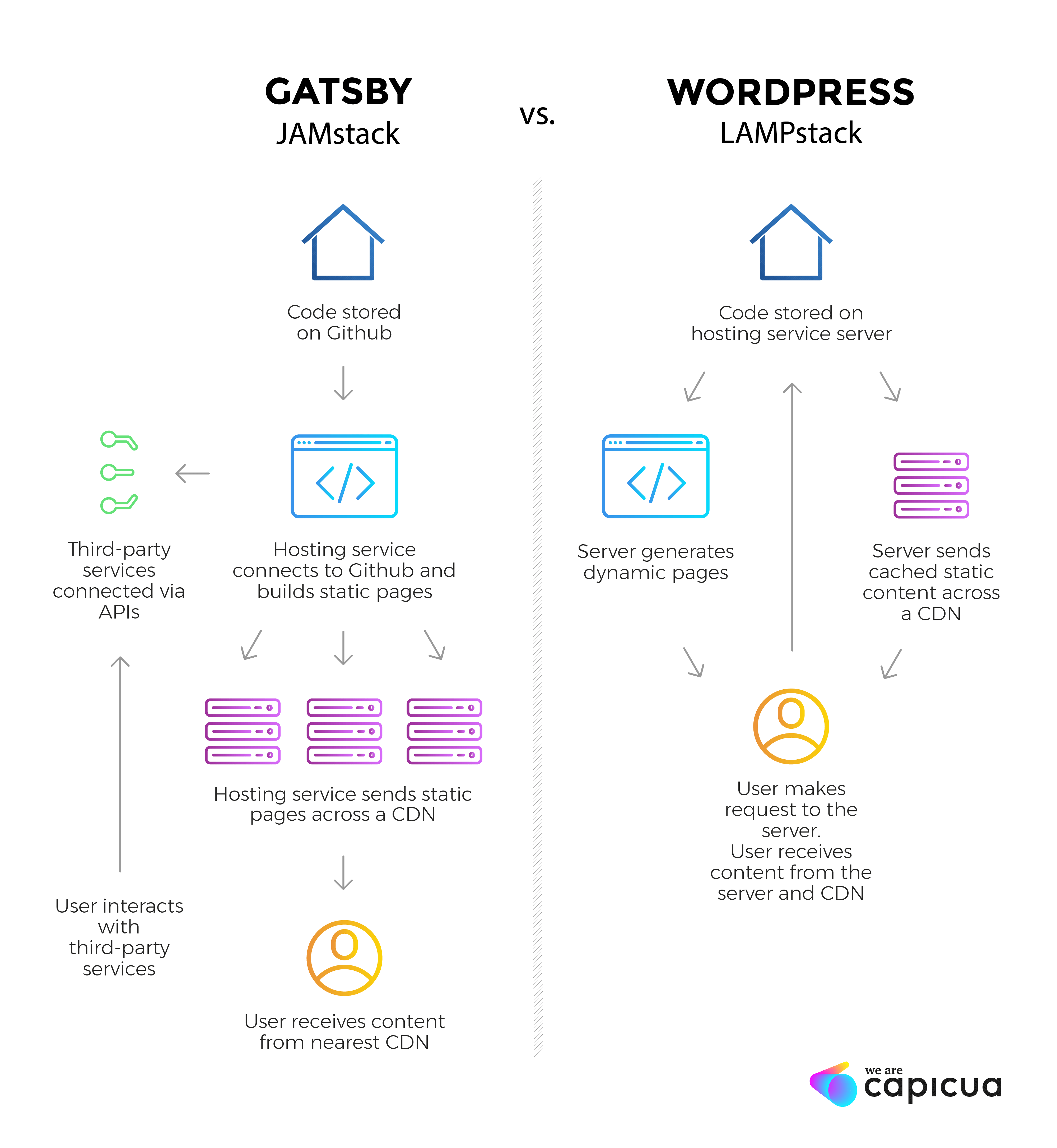 Moving to the Jamstack involves using one of the headless CMS or your own backend that provides an API. Major site updates are done through Git, with the site completely rebuilt from scratch using modern build tools such as static site generators. Each new deployment can be launched via Git or via the CMS of a static site.